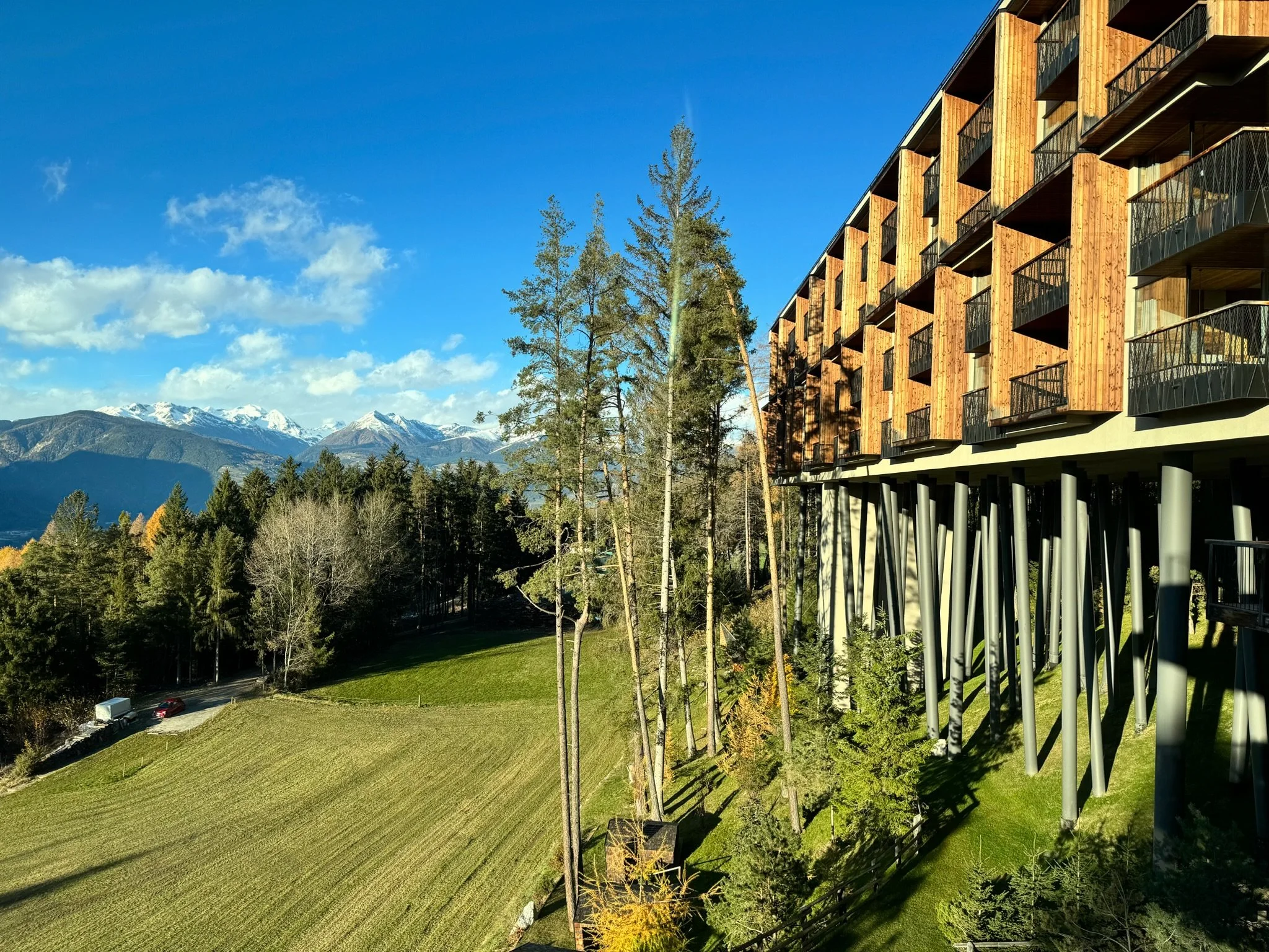 My Arbor ist nicht "niedlich" – es ist ein Statement in moderner Architektur. Holz (Lärche, Fichte, Birke), Quarzit, Glas. Überall Panoramafenster auf die Dolomiten. Das Hotel wurde mit 15 Monaten Bauzeit 2018 eröffnet.
